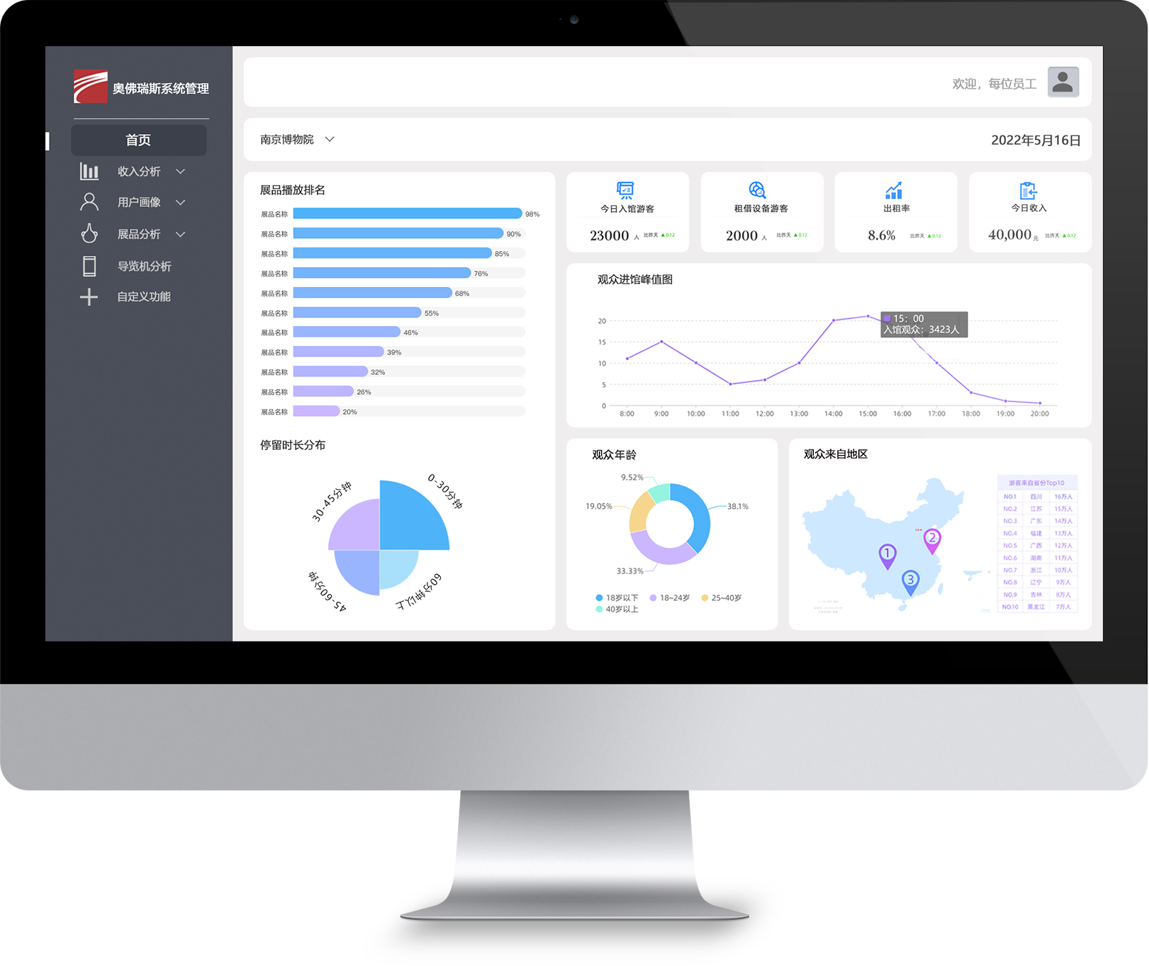 从观众偏向、年龄占比、观众性别分布、地域分布等对用户进行分析,帮助客户实时了解展览和展品受欢迎程度,对观众的喜好进行分析了解。